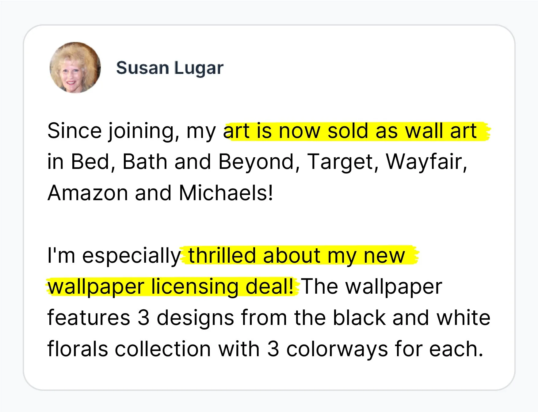 Her latest licensing deal is now being considered for placement in Target, Wayfair, Michaels, Macy's, Nordstrom Rack, Home Depot, Lowe's, Walmart, and Kohl's.
